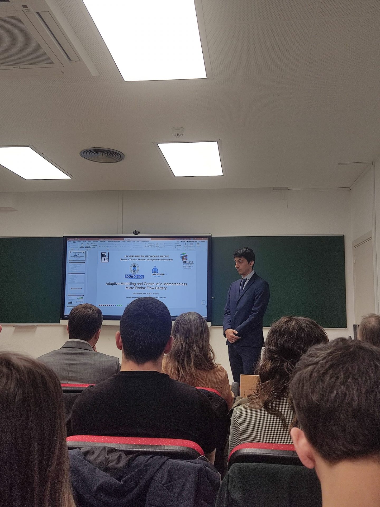 Last Thursday, March 7th, our colleague Alberto Bernaldo presented his Ph.D. dissertation called “Adaptive modeling and control of a membraneless micro redox flow battery”. The thesis committee, formed by specialists in the field of electronics, automation, and flow batteries, evaluated with the maximum grade and recognized great effort and scientific innovation in his research. We want to congratulate our colleague Dr. Bernaldo De Quirós and his director Dr. Prof. Javier Uceda for the great job.